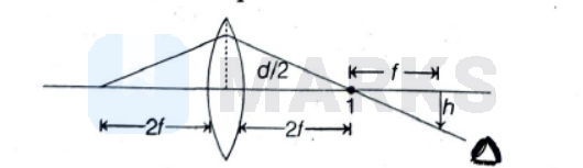 A point object is placed on the optic axis of a convex lens of focal length $f$ at a distance of $2 f$ to the left of it. The diameter of the lens is $d$. An eye is placed at a distance of $3 f$ to the right of the lens and a distance $h$ below the optic axis. The maximum value of $h$ to see the image is