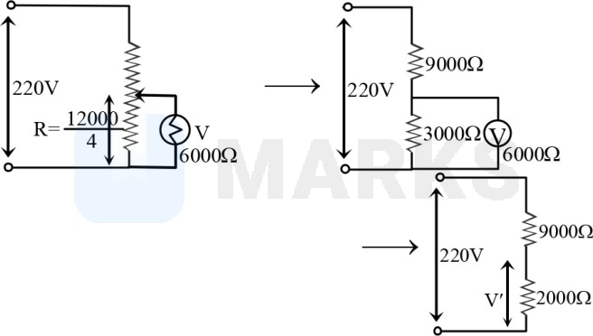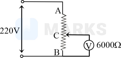 A potential difference of is applied across a rheostat of . The voltmeter has a resistance of and distance is one-fourth of the distance from to . The error in the reading of voltmeter is approximately -