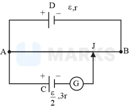 A potentiometer wire having length and resistance is joined to a cell of emf and internal resistance . A cell having EMF and internal resistance is connected. The length , at which the galvanometer, as shown in the figure, shows no deflection is