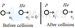 A proton moving with a velocity of collides with a stationary helium atom. The velocity of the proton after the collision is