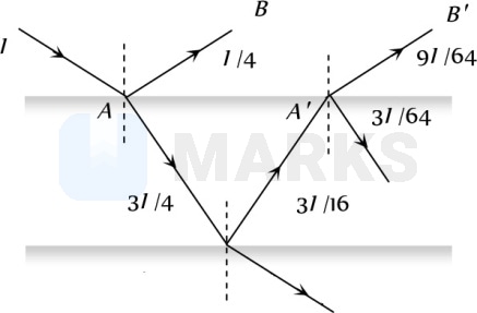 A ray of light of intensity is incident on a parallel glass-slab at the point and it undergoes partial reflection and refraction as shown in the figure. At each reflection, of the incident energy is reflected and the rest is transmitted. If the rays and undergo interference, then the ratio is