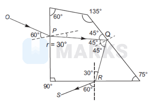 From the figure, we can see that angle between incident ray $O P$ and emergent ray $R S$ is $90^{\circ}$.
