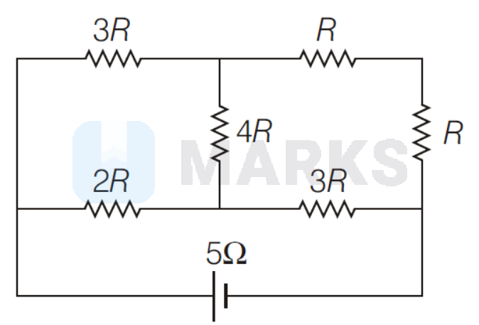 A resistance network is connected to a battery as shown in the figure below. If the internal resistance of the battery is $5 \Omega$, then the value of $R$ (in $\Omega$ ) for maximum power delivered to the network is