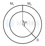 A ring-shaped tube contains two ideal gases with equal masses and relative molar masses and . The gases are separated by one fixed partition and another movable stopper which can move freely without friction inside the ring. What is the value of the angle (in degree) at equilibrium?