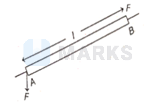 A rod m long is acted upon by a couple as shown in the figure. The moment of couple is Nm. If the force at each end of the rod, then magnitude of each force is