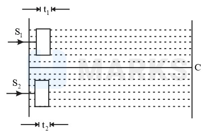 A screen is at a distance from a diaphragm having two narrow slits and which are apart. The slit is covered by a transparent sheet of thickness and the slit by another sheet of thickness as shown in the figure. Both sheets are made of the same material having a refractive index . Water is filled in space between the diaphragm and the screen. A monochromatic light beam of wavelength is incident normally on the diaphragm. Assuming the intensity of the beam to be uniform and slits of equal width, calculate the ratio of intensity at to the maximum intensity of interference pattern obtained on the screen, where is the foot of the perpendicular bisector of . [Refractive index of water, ]