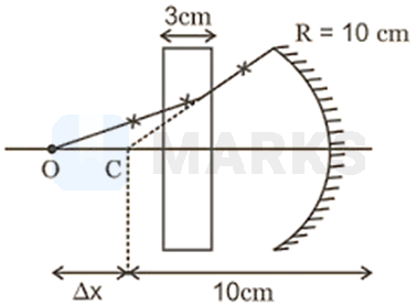 A slab of a glass of refractive index and thickness is placed with the faces perpendicular to the principal axes of a concave mirror. If the radius of curvature of the mirror is , the distance at which an object must be placed from the mirror so that image coincides with the object is