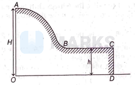 A small disc of mass $m$ slides down with initial velocity zero from the top $(A)$ of a smooth hill of height $H$ having a horizontal portion $(B C)$ as shown in the figure. If the height of the horizontal portion of the hill is $h$, then the maximum horizontal distance covered by the disc from the point $D$ is