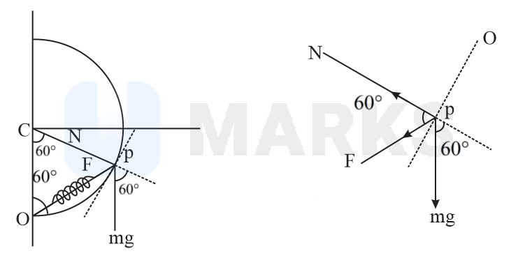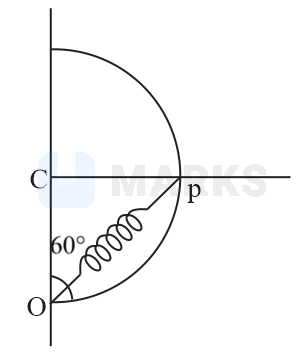 A smooth semicircular wire track of radius is fixed in a vertical plane. One end of a massless spring of natural length is attached to the lowest point of the wire track. A small ring of mass which can slide on the track is attached to the other end of the spring. The ring is held stationary at point such that the spring makes an angle of with the vertical. The spring constant . Consider the instant when the ring is released. The normal reaction on the ring by the track is
