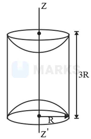A solid cylinder is made of radius R and height 3R having mass density . Now two half spheres of radius R are removed from both ends. The moment of inertia of remaining portion about axis ZZ' can be calculated as . Find K.