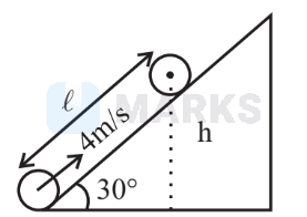 $\begin{aligned} & \text { As P.E } \mathrm{E}_{\mathrm{i}}+(\mathrm{K} . \mathrm{E})_{\mathrm{i}}=(\mathrm{P} . \mathrm{E})_{\mathrm{f}}+(\mathrm{K} . \mathrm{E})_{\mathrm{f}} \\ & \Rightarrow \quad 0+\frac{1}{2} \times \mathrm{m} \times 4^2+\frac{1}{2}\left(\frac{2}{5} \mathrm{mR}^2\right) \times \frac{4^2}{\mathrm{R}^2}=\mathrm{mgh} \\ & \Rightarrow \quad \frac{4^2}{2}+\frac{1}{5} \times 4^2=10 \mathrm{~h} \Rightarrow 8+3.2=10 \mathrm{~h} \\ & \Rightarrow \quad 1.12=\mathrm{h} \Rightarrow \mathrm{h}=1.12 \mathrm{~m} \\ & \text { So, } \ell=\frac{\mathrm{h}}{\sin 30^{\circ}}=\frac{\mathrm{h}}{1 / 2}=2 \mathrm{~h}=2.24 \mathrm{~m}=224 \mathrm{~cm}\end{aligned}$