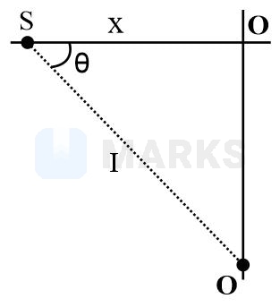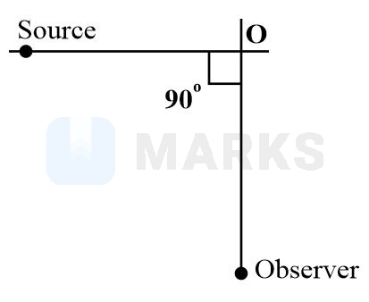 A source and an observer are situated on two perpendicular tracks as shown in the figure. The observer is at rest and the source is moving with a speed of . The source emits a sound wave of frequency , which travel in the medium with a velocity of . The frequency of the sound heard by the observer when the source crosses the origin is