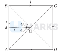 $\Rightarrow \quad B=\frac{4 \mu_0 I}{4 \pi\left(\frac{a}{2}\right)}\left(\frac{1}{\sqrt{2}}+\frac{1}{\sqrt{2}}\right) \Rightarrow B=\frac{2 \mu_0 I}{\pi a} \frac{2}{\sqrt{2}}$