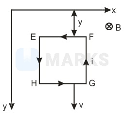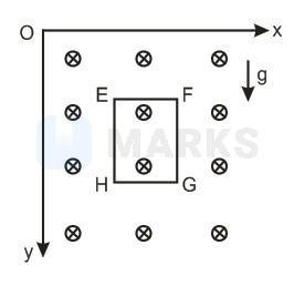 A square loop of side , mass and total resistance is falling under gravity in a region of transverse non-uniform magnetic field given by , where is a positive constant and is the position of side of the loop. If at some instant the speed of the loop is , then the total Lorentz force acting on the loop is