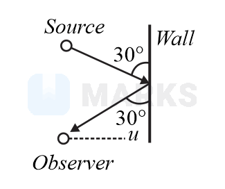 A stationary source (see figure) emits sound waves of frequency towards a stationary wall. If an observer moving with speed in a direction perpendicular to the wall measures a frequency at the instant shown, then is related to the speed of sound as
