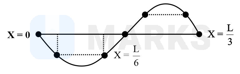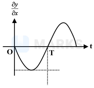 A stationary wave of amplitude is generated between the two fixed ends and . The particle at is a node. There are only two particles between and which have maximum speed half of the maximum speed of the anti-node. Again there are only two particles between and which have maximum speed half of that at the antinodes. The slope of the wave function at changes with respect to time according to the graph shown. The symbols , and are having their usual meanings if used in calculations.