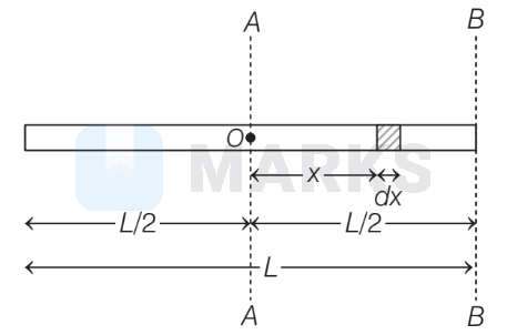 $\begin{aligned} & I_{A A}=\int_{-L / 2}^{+L / 2} x^2 \times \lambda|x| d x=\int_{-L / 2}^{+L / 2} x^2 \times 16|x| d x \\ & {\left[\because \lambda=16 \mathrm{~kg} / \mathrm{m}^2 \text { (given) }\right]} \\ & =16 \int_{-L / 2}^{+L / 2} x^2|x| d x \\ & =16\left[\int_{-L / 2}^0 x^2(-x) d x+\int_0^{+L / 2} x^2(+x) d x\right] \\ & \because \because x \mid=\left\{\begin{array}{ll}-x & ; \text { if } x < 0 \\ +x & ; \text { if } x \geq 0\end{array}\right] \\ & \end{aligned}$