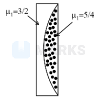 A thin plano-convex lens fits exactly into a plano-concave lens with their plane surface parallel to each other as shown in the figure. The radius of curvature of the curved surface \( R=30 \mathrm{~cm} \). The lens is made of a different material having refractive index \( \mu_{1}=\frac{3}{2} \) and \( \mu_{2}=\frac{5}{4} \) as shown in the figure. If the plane surface of the plano-convex lens is silvered, then calculate the equivalent focal length of this system (in \( \mathrm{cm} \) ).