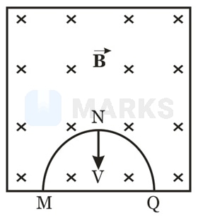 A thin semicircular conducting ring of the radius is falling with its plane vertical in a horizontal magnetic induction . At the position MNQ, the speed of the ring is and the potential difference developed across the ring is