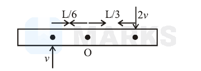 A thin uniform bar of length $\mathrm{L}$ and mass $8 \mathrm{~m}$ lies on a smooth horizontal table. Two point masses $\mathrm{m}$ and $2 \mathrm{~m}$ moving in the same horizontal plane from opposite sides of the bar with speeds $2 \mathrm{v}$ and $v$ respectively. The masses stick to the bar after collision at a distance $\frac{\mathrm{L}}{3}$ and $\frac{\mathrm{L}}{6}$ respectively from the centre of the bar. If the bar starts rotating about its center of mass as a result of collision, the angular speed of the bar will be: