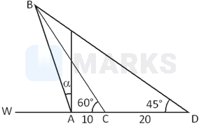 A tower leans towards west making an angle with the vertical. The angular elevation of , the top most point of the tower, is as observed from a point due east of at a distance of from If the angular elevation of from a point due east of at a distance of from is , then the value of is equal to