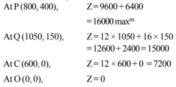 $\Rightarrow \mathrm{Z}$ is maximum at $\mathrm{P}(800,400)$. The maximum value of $\mathrm{z}$ is $\mathrm{₹} 16000$.
