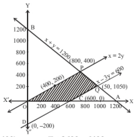 Thus L.P.P may be stated as to maximize profit, $Z=12 x+16 y$ constraints are $x+y \leq 1200, x-3 y \leq 600, y \leq \frac{x}{2}, x, y \geq 0$