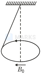 A uniform current carrying ring of mass m and radius R is connected by a massless string as shown in diagram. A uniform magnetic field B0 exists in the region to keep the ring in horizontal position, then the current in the ring is ( length of string)
