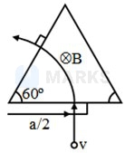 A uniform magnetic field exists in region which forms an equilateral triangle of side . The magnetic field is perpendicular to the plane of the triangle. A charge enters into this magnetic field perpendicularly with speed along perpendicular bisector of one side and comes out along the perpendicular bisector of other side. The magnetic induction in the triangle is