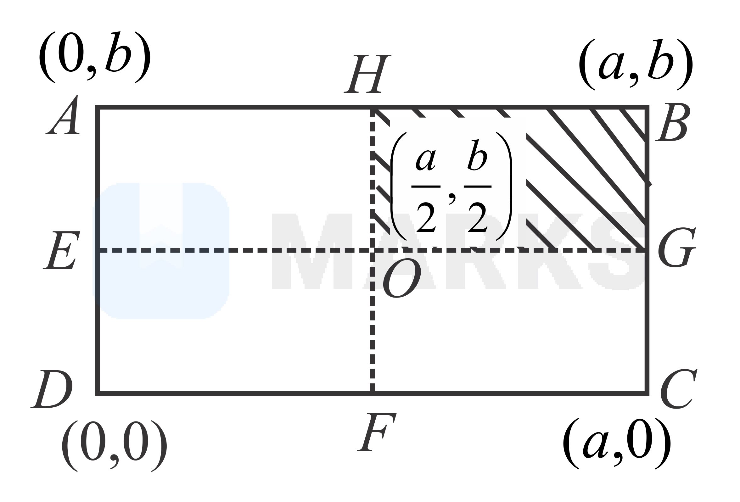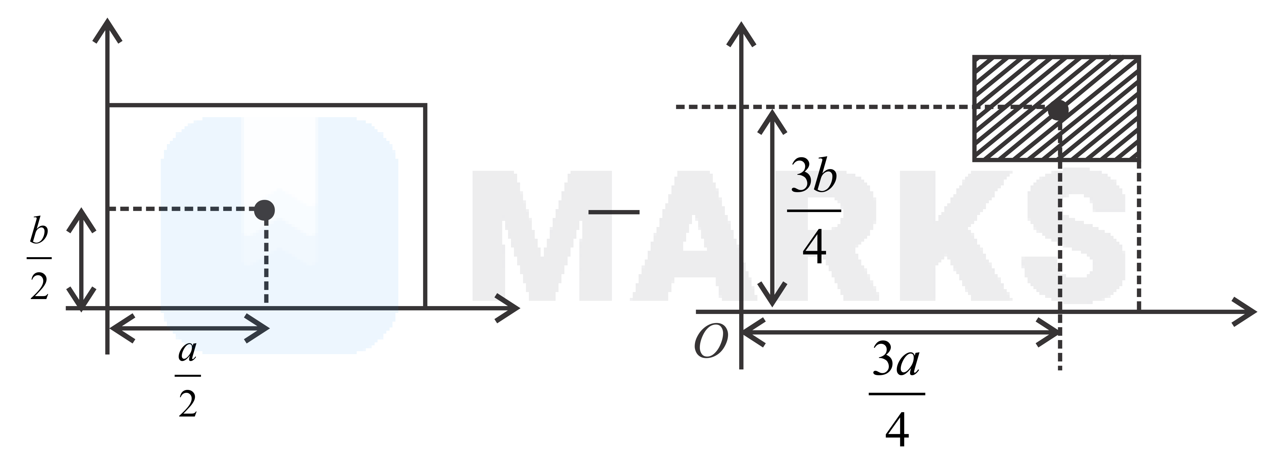 A uniform rectangular thin sheet of mass has length and breadth , as shown in the figure. If the shaded portion is cut-off, the coordinates of the centre of mass of the remaining portion will be: