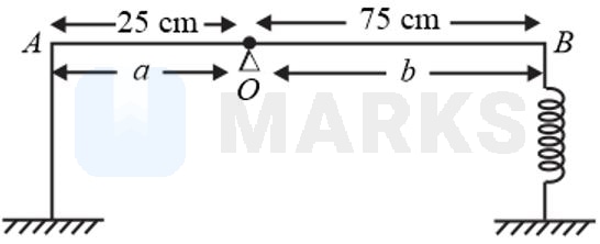 A uniform rod of mass and length is placed on a sharp support , such that and . A spring of force constant is attached to the end , as shown. Initially, the spring is extended by at equilibrium. As soon as the thread is burnt, find the normal force (in ) exerted by the support at .
