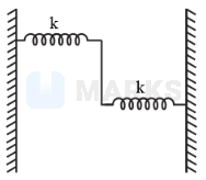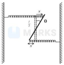 A uniform rod of length and mass is pivoted at the centre. Its two ends are attached to two springs of equal spring constant . The rod is gently pushed through a small angle in one direction and released. The frequency of oscillation is (the springs are fixed to the walls)
