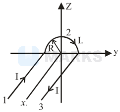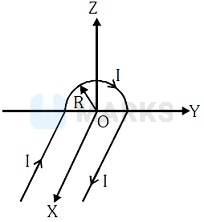 A wire carrying current has the shape as shown in adjoining figure. Linear parts of the wire are very long and parallel to -axis while semicircular portion of radius is lying in - plane. Magnetic field at point is :