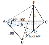 Where $\mathrm{PQ}$ is tower and $\mathrm{ABC}$ is the park, with $\mathrm{Q}$ being mid point of the side $\mathrm{BC}$ and $\mathrm{PQ}=\mathrm{h}$ Also, $A Q^{2}+B Q^{2}=100^{2}$