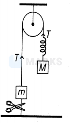 When string is cut, mass remains static and spring snaps. For mass at the instant string is cut, forces on are