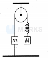 An arrangement of spring, strings, pulley and masses is shown in the figure below.