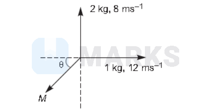 An explosion blows a rock into three parts. Two parts go off at right angles to each other. These two are, $1 \mathrm{~kg}$ first part moving with a velocity of $12 \mathrm{~ms}^{-1}$ and $2 \mathrm{~kg}$ second part moving with a velocity of $8 \mathrm{~ms}^{-1}$. If the third part flies off with a velocity of $4 \mathrm{~ms}^{-1}$, its mass would be