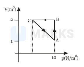An ideal gas is taken through the cycle , as shown in the figure. If the net heat supplied to the gas in the cycle is , the work done by the gas in the process is