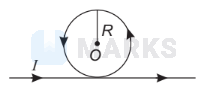 An infinitely long straight conductor is bent into the shape as shown below. It carries a current of I ampere and the radius of the circular loop is R metre. Then, the magnitude of magnetic induction at the centre of the circular loop is