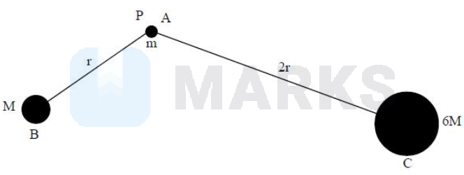 An object A of mass ' $m$ ' is located at a point ' $\mathrm{P}$ ' at distances ' $\mathrm{r}$ ' and ' $2 \mathrm{r}$ ' from two planets $B$ and $C$ of masses ' $M$ ' and ' $6 M$ ' respectively as shown in the figure. If the escape speed of the object A from point ' $\mathrm{P}$ ' due to the gravitational influence of only planet B is $5 \mathrm{kms}^{-1}$, then the escape speed of the object A from point ' $\mathrm{P}$ ' due to the gravitational influence of both the planets is ____ $\mathrm{kms}^{-1}$.