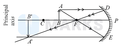 For the concave mirror, the extended image in this case forms between the focal point and the center of curvature of the mirror. It is inverted with respect to the object, is a real image, and is smaller than the object.