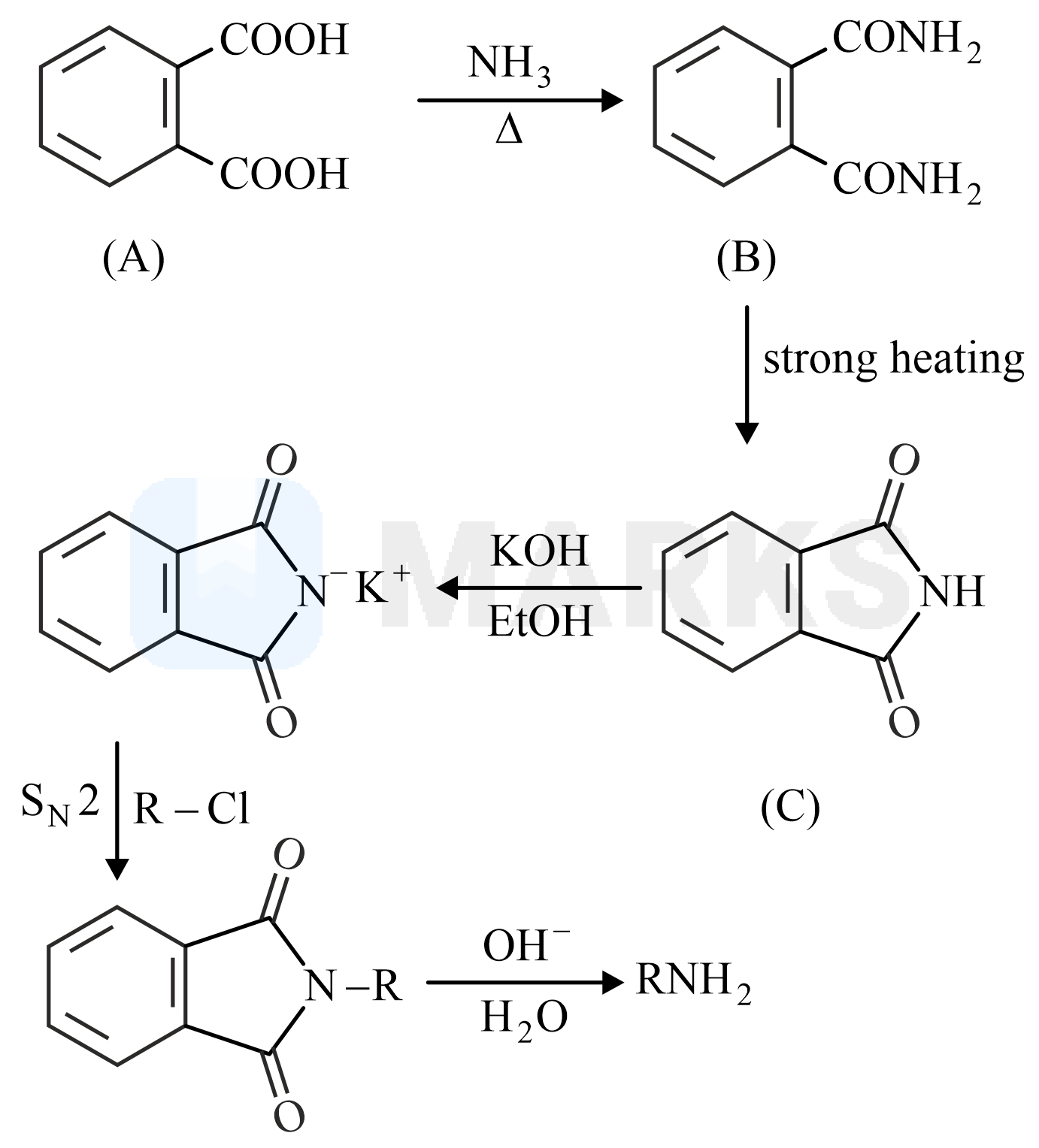 Gabriel Phthalimide reaction: The hydrogen of the imide is acidic which can be extracted with base. Now, the nucleophile formed undergo bimolecular nucleophilic substitution reaction with alkyl chloride. Now, the alkyl imide undergo hydrolysis to give primary amine.