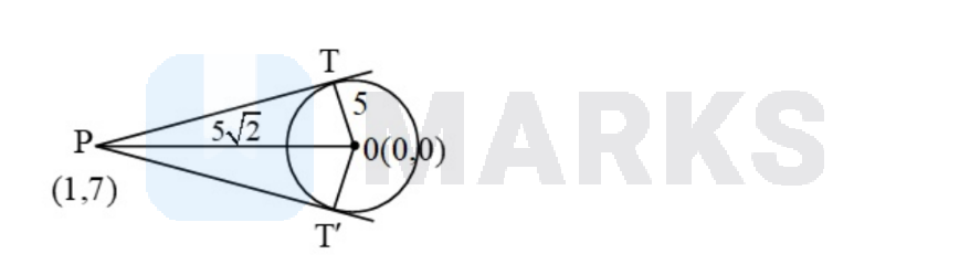 $\begin{aligned} & \mathrm{OP}=5 \sqrt{2} \\ & \mathrm{OT}=5 \\ & \mathrm{PT}=\sqrt{\mathrm{OP}^2-\mathrm{OT}^2}=5 \\ & \Rightarrow \angle \mathrm{OPT}=45^{\circ} \\ & \Rightarrow \angle \mathrm{TPT}^{\prime}=2 \angle \mathrm{OPT}=2 \times 45^{\circ}=90^{\circ}\end{aligned}$