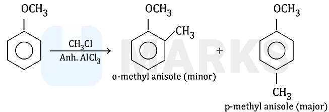 Anisole on reaction with chloromethane in presence of anhydrous gives o-methyl anisole and p-methyl anisole.