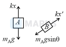As shown in the figure, an iron block of volume is attached to a spring of unstretched length and hanging to the ceiling of a roof. The spring gets stretched by . This block is removed and another block of iron of volume is now attached to the same spring and kept on a frictionless incline plane of inclination. The distance of the block from the top along the incline at equilibrium is