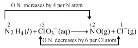Thus, \(\mathrm{N}_2 \mathrm{H}_4\) is acting as a reducing agent while \(\mathrm{ClO}_3^{-}\)is acting as oxidising agent.