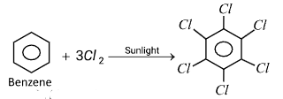 Benzene reacts with chlorine to form benzene hexachloride in presence of