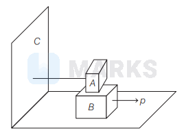 Block $A$ of mass $100 \mathrm{~kg}$ is kept above another block $B$ of mass $300 \mathrm{~kg}$. $A$ is tied to the wall $C$ with a horizontal string. The coefficient of friction between $A$ and $B$ is 0.35 and that between $B$ and the horizontal surface is 0.5 . Find the horizontal force $p$, necessary to move the block $B$.