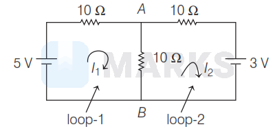 Given, circuit diagram is shown in the figure, If $I_1$ and $I_2$ be the loop currents in loop (1) and loop (2), respectively then