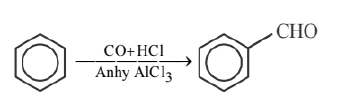 In Gatterman-Koch reaction, benzene or its derivative is treated with $\mathrm{CO}$ and $\mathrm{HCl}$ in presence of anhydrous aluminium chloride to produce benzaldehyde.